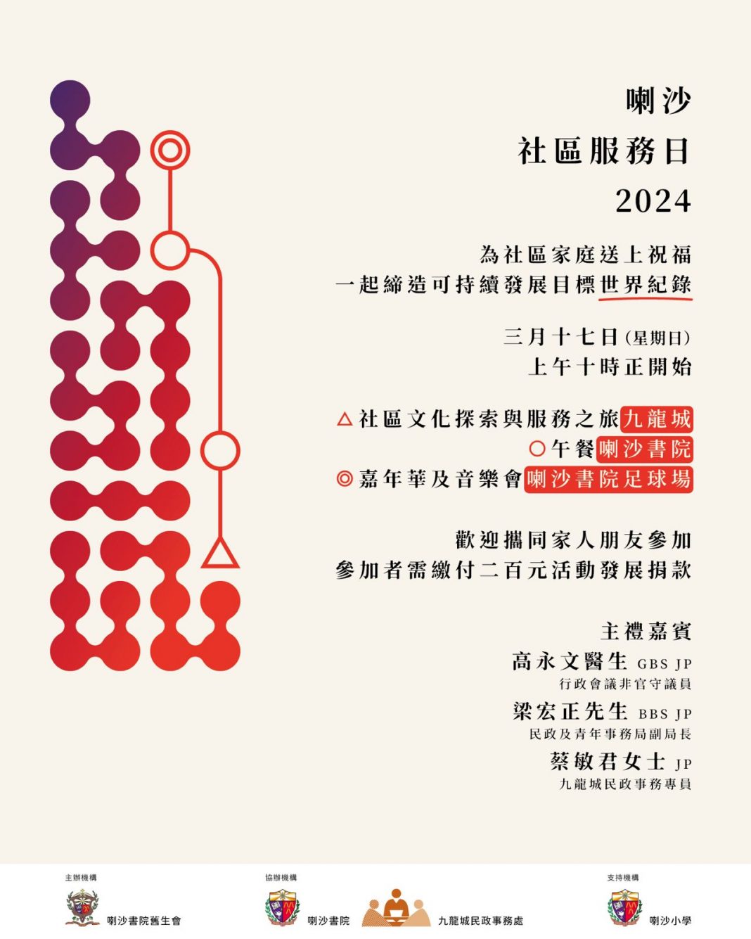 The La Salle Community Service Day is jointly organised by La Salle College and the Kowloon City District Office, and supported by La Salle Primary School. Details as follow: