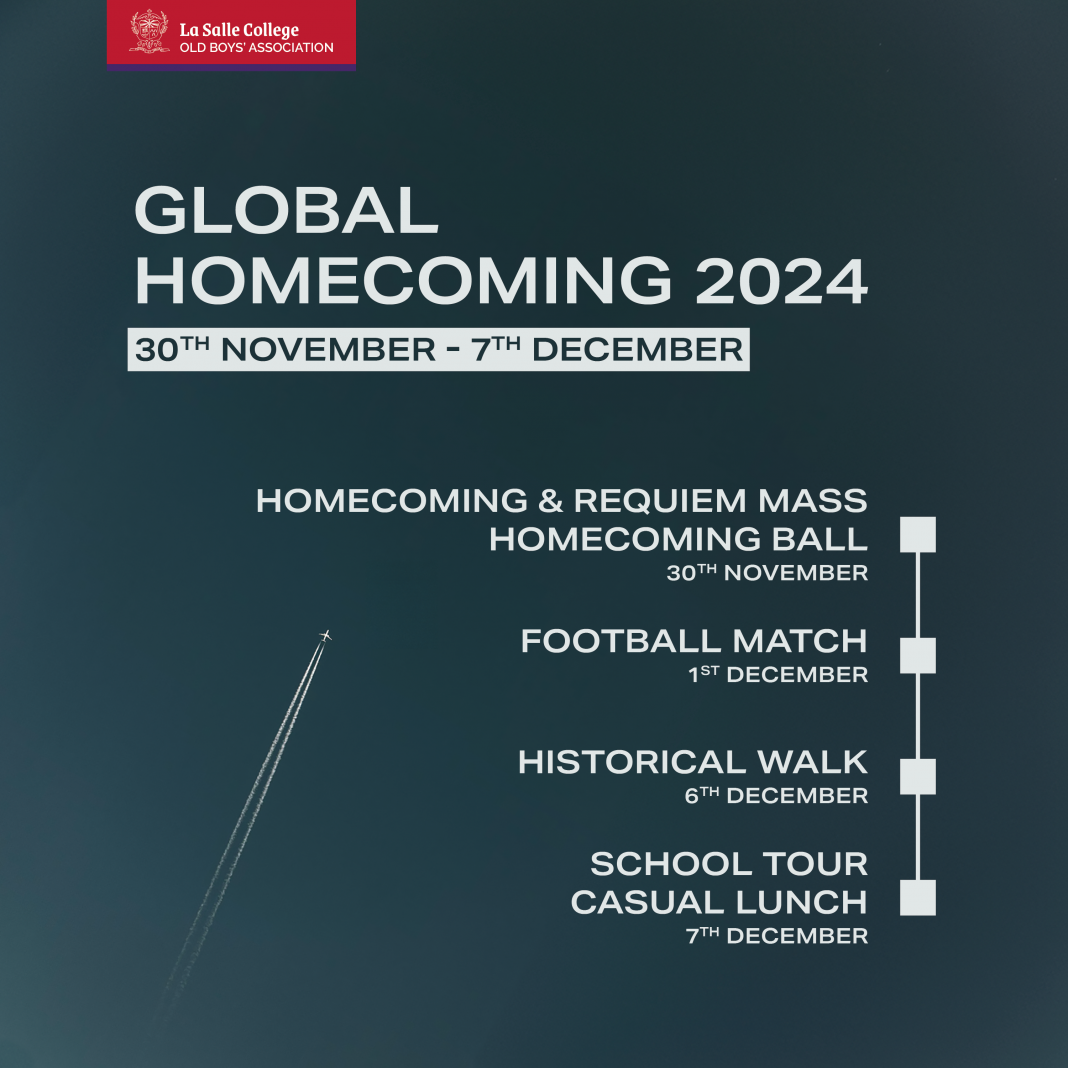 - Homecoming and Requiem Mass, 30 November 2024: The first programme, Homecoming and Requiem Mass, will be held at 11:00 a.m. at the School Chapel. We will be praying for our departed Lasallians Brothers, Old Boys and teachers. It is an opportunity to come back to our Alma Mater to worship God and pray with other Lasallians.