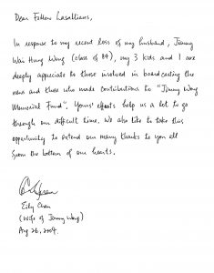 Message from Alexander Cheung, President of LSCOBA – Toronto Chapter on 15 August 2004. I am deeply saddened to inform you that one of our fellow Old Boys, Jimmy Wong (84), passed away last Thursday. I got to know Jimmy just two years ago when our Chapter was trying to revive our soccer team. I still remember vividly how Jimmy scored one of the two goals when we played against Wah Yan Kowloon almost two years ago making us winners that day. We certainly will miss his pressence from now on. Jimmy is survived by his wife, Eily, and three very young children ages from 1 1/2 to 5. Here are the details of the funeral service: Visitation: Friday (Aug 20) 6:00 pm – 9:00 pm Elgin Mills Cemetery Chapel (Elgin Mills & Leslie) Funeral service: Saturday (Aug 21) 9:30 am – 11:30 am St Agnes K Y Tsao Catholic Church (16th Ave & Rodick, East of Woodbine). May God comfort Jimmy’s family in this midst of difficult time. Alexander