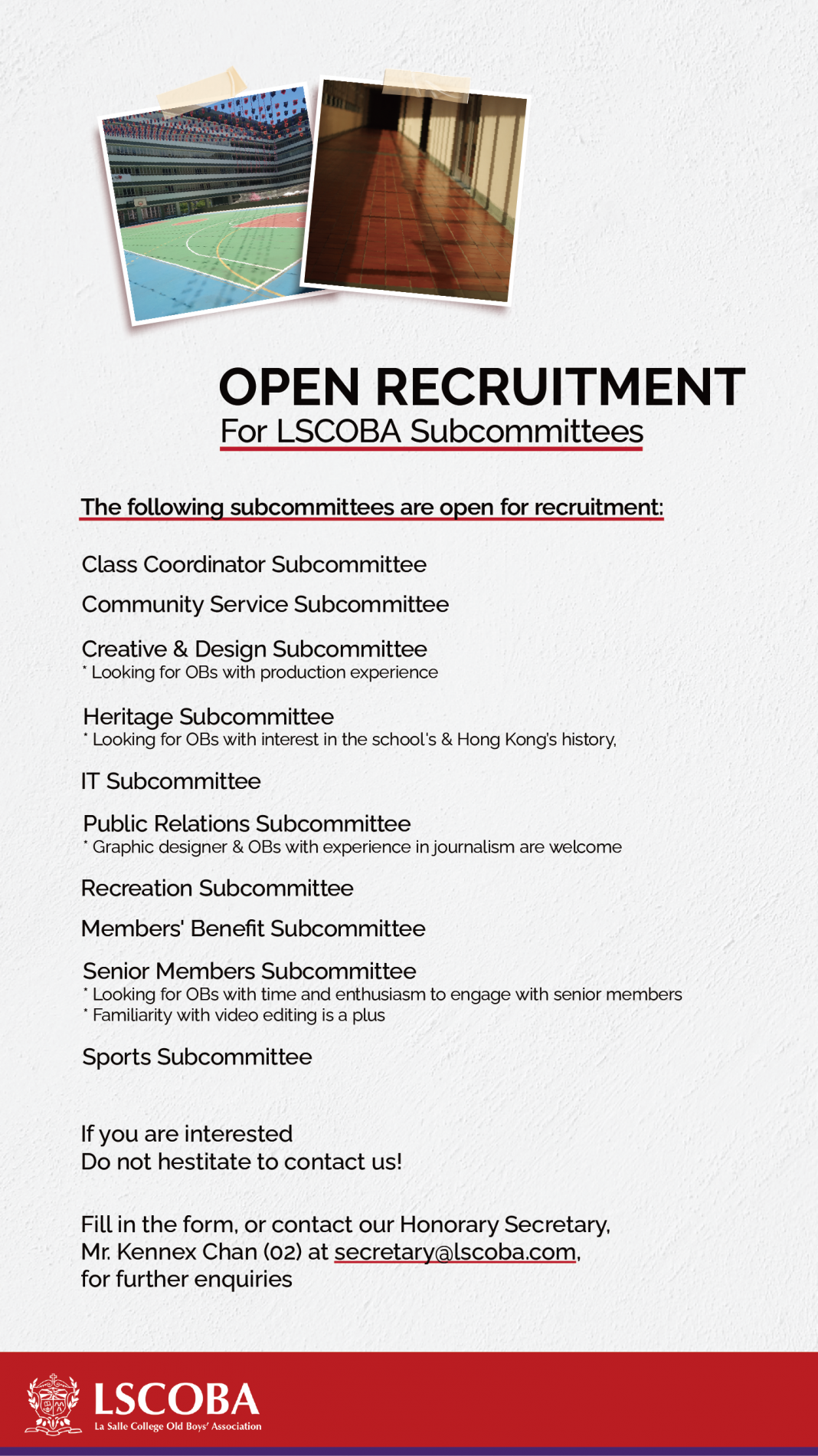 The LSCOBA Committee is conducting an open recruitment exercise for Subcommittee Members such that all OBA Members share the opportunity to participate in its management and contribute to the School and Old Boys community.